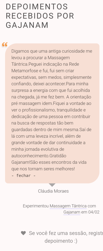 Se você já recebeu a massagem tântrica, comigo, me manda teu depoimento que eu coloco aqui no site, pode ser de forma anônima.