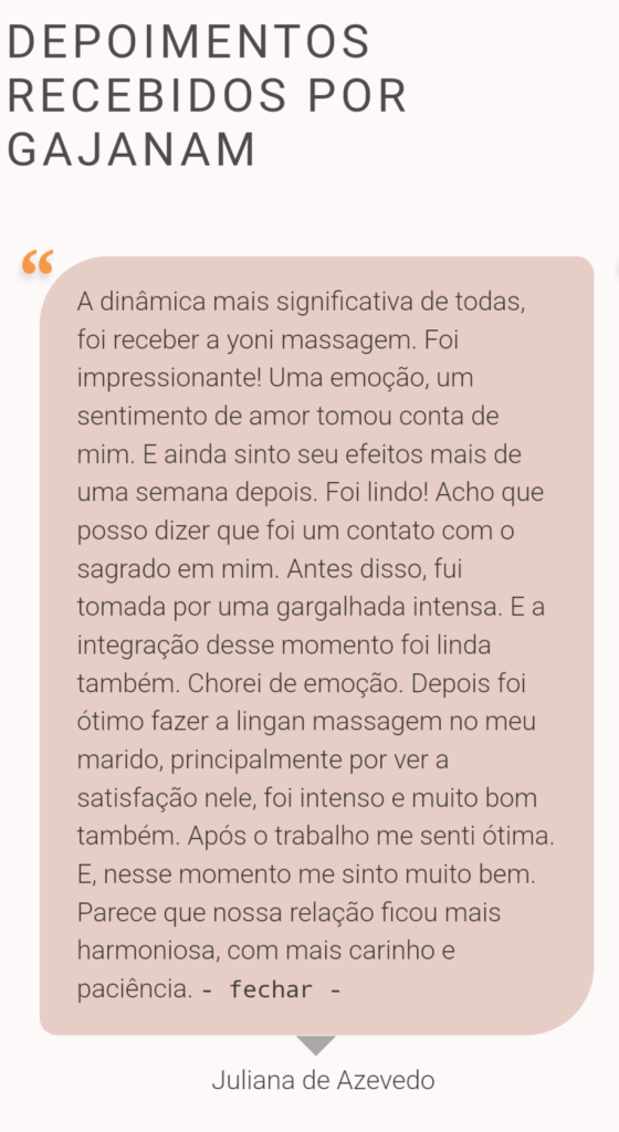 Não recomendamos que pessoas com interesses sexuais participem desse trabalho. Na Visão Tântrica do Caminho do Amor, a idéia do sexo destrói a possibilidade da pessoa libertar-se dos seus condicionamentos e dos velhos paradigmas, encontrando o seu refúgio de paz, conhecendo aspectos de sua natureza espiritual, divina, sagrada.