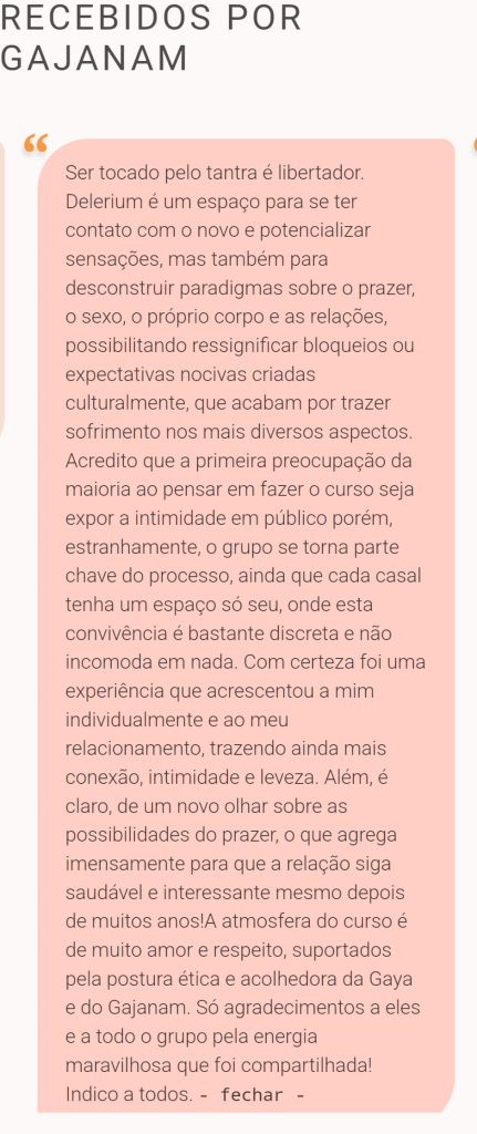 Delerium proporciona um Salto Quântico no paradigma das relações sexuais e afetivas, oferecendo uma profunda transformação a partir de dinâmicas que utilizam a energia sexual de base para alcançar a Alquimia Tântrica, através do prazer e do êxtase.